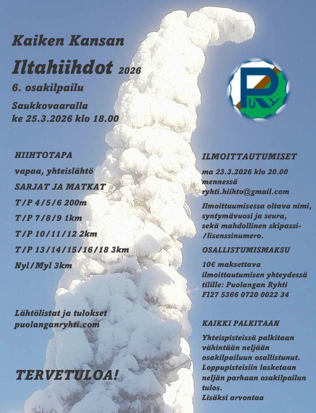 Kaiken Kansan iltahiihdot kuudes ja viimeinen osakilpailu Honkavaarassa keskiviikkona 3.4.2024 klo 18.00 vapaalla hiihtotavalla ja yhteislähdöllä. Tulokset lisätty